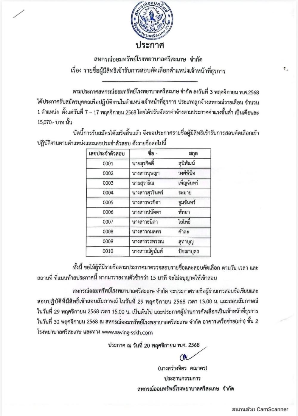 ประกาศรายชื่อผู้มีสิทธิ์สอบ ตำแหน่ง เจ้าหน้าที่ธุรการ